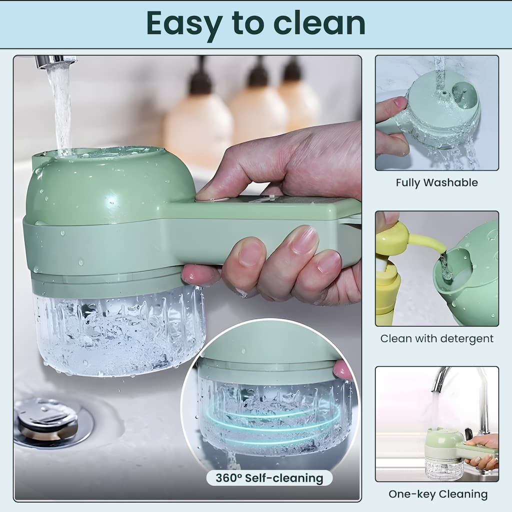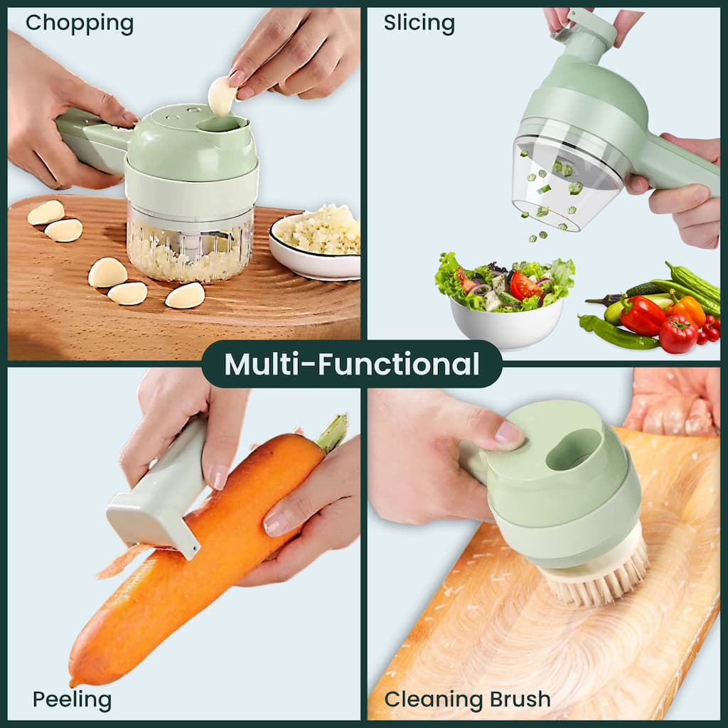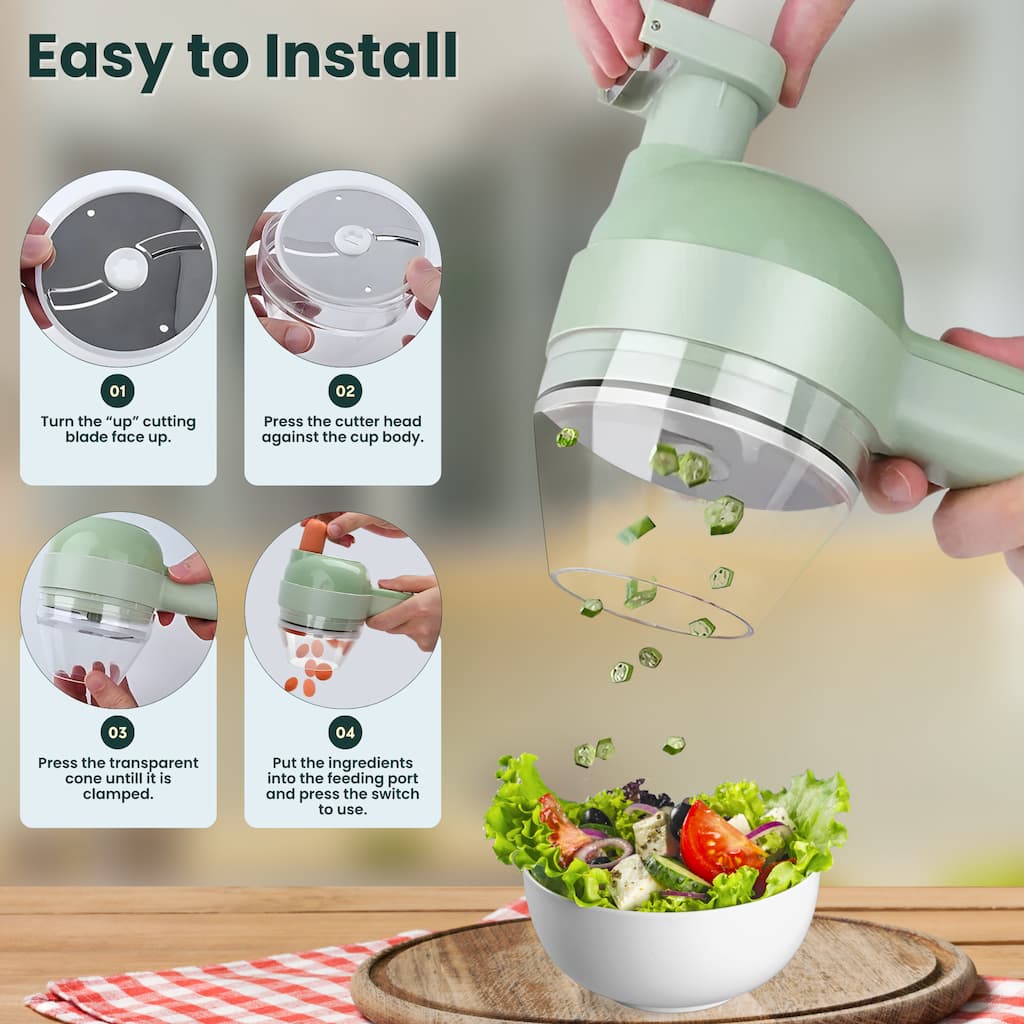 The stainless-steel blades and 4-in-1 design handle both soft and tough ingredients with ease — from carrots and cucumbers to sausages and potatoes — without crushing or jamming.